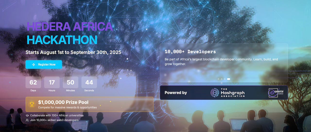 #Africa #blockchain — The Swiss-based Hashgraph Association and Exponential Science Foundation has unveiled the Hedera Africa Hackathon 2025, with a $1 million prize pool. It kicks off now, with events over June and July and the main hackathon in August, targeting 10,000 participants across 15 countries. (Hedera Hackathon)